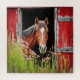 La tête d'un cheval qui sort de la porte de la grange avec des fleurs sauvages roses