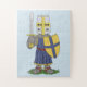 Un mignon chevalier caricaturé vêtu de courrier et grand gouvernail tient son épée haute, prêt à défendre son château.
