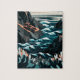 Coastal Energy: This vibrant flat vector illustration captures the dynamic beauty of a rocky beach from an overhead perspective. Dark blue and orange ames life to the scene as waves crash onto the shore, creating a captivating contrast Geometric shapes add depth, while detailed textures on rocks and plants bring a natura natural feel to this stylized artwork. The minimalistic design emphasizes movement and energy, making it a perfect piece for those looking to add bold and modern coastal vibe to their collection.