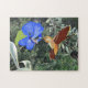 Ce puzzle lumineux et coloré, détaillé et découpé présente un colibri orange sirotant une fleur bleue d'Hibiscus, dressé contre des plantes tropicaux.