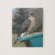 Une belle photo d'un faucon de Cooper qui attend sur un mangeur d'oiseaux pour son déjeuner à venir.