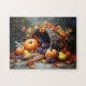 Un tableau vibrant d'une cornucopie débordant de citrouilles, de raisins, de poires, de blé et de feuilles d'automne.