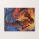 Une belle sirène tenant une harpe est sur le point de quitter une grotte au coucher du soleil.