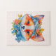 Un puzzle avec l'illustration d'un adorable portrait de renard avec une couronne et un collier bleu et orange.