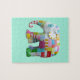 A cute design of a patchwork elephant in pastel rainbow colours against a light sky blue background. This animal is a whimsical, childlike, retro toy inspired design of a popular elephant Savannah African animal.