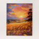 Ce puzzle présente une illustration éclatante d'un coucher de soleil sur un champ de blé doré et des fleurs violettes.