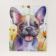Image art numérique d'un Bulldog français à l'expression ludique, entouré de fleurs vives et colorées. L'arrière - plan présente des éclaboussures de couleurs vives, donnant à la scène une atmosphère animée et énergique.