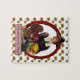 Pèlerin jugeant un citrouille et des raisins, se tenant à côté d'une dinde avec la déclaration au-dessous des "joies de Thankgiving", entourées par le feuille d'automne