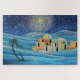 Ce puzzle présente une scène de Noël d'une étoile sur la ville de Bethléem avec des palmiers et un dessert. Les couleurs sont le bleu, le bleu foncé, l'orange et l'or.