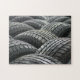 Photographie de pneus soigneusement entreposés imprimés sur les bords du puzzle.