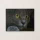 Eine nah-up-Aufnahme des Gesichts einer grauen Katze mit gelben Augen und verdünnten Schülern, die den Kopf auf der Pfote ruht und etwas hinter der Kamera scharf starrt.