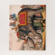 Impression vintage d'hommes faisant un acte de cirque avec un éléphant. Un homme est en train de rouler sur les défenses, un autre est allongé sous l'animal.