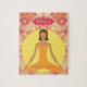 Une femme avec les cheveux bruns dans une pose de yoga avec de l'énergie positive et le mot "yoga" en haut