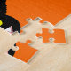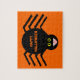 Ce puzzle impressionnant présente une araignée noire éffrayante avec huit pattes poilues, des yeux jaunes avec de grands élèves noirs et sa bouche ouverte montrant ses crocs. Il y a un texte orange qui dit "Happy Halloween" et un arrière - plan orange correspondant.