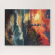 Ce puzzle présente une illustration éclatante d'un phare rouge et blanc assis sur une falaise océanique tandis que le ciel brûle un rouge vif avec un coucher de soleil. Des vagues blanches et turquoises s'écrasent vers un rivage rocheux brun.