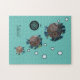 Famille de poissons. Trois poissons en céramique, chacun avec différentes fleurs sur le corps et nageoires bleues et vertes de fil. Un poisson plus grand conduit deux petits poissons vers l'avant. Le texte "École" est en bas à gauche. Les bulles montent en haut à droite. La gauche montre un rose de boussole pour donner une direction. Arrière - plan de bleu pâle. Oeuvre originale de Nora Chen.