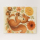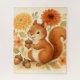 Une aquarelle illustrant un écureuil ludique aux glands, niché au milieu de fleurs d'automne douillettes, mamans et dahlias.