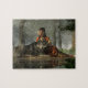 Une femme amérindienne est assise avec son ami, un loup gris, près d'un étang dans la forêt. Le soleil brille à travers les feuilles pour éclairer la paire. La femme vous regarde confiante que son protecteur la protégera de vous. Le loup vous regarde comme si vous étiez en train de dîner.