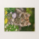 Un jeune beau chaton tigré brun de ragondin du Maine se reposant curieusement dans un pré fleuri au printemps. Une photo mignonne de chat de coonie prise par Katho Menden. Ce jeu animal de puzzle de photo est une idée de cadeau pour des amoureux de les chats. http://www.zazzle.com/kathom_photo