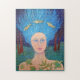 Le beau visage d'une femme avec le vol de poissons dans ses cheveux et feuille a équilibré en or dans la forêt.
