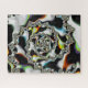 Ce puzzle présente un art fractal en spirale psychédélique abstrait en noir et blanc avec des accents jaunes, orange, bleus et verts.