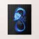 Luminous infinity symbol with glowing, beautiful, lushly blooming rose made of blue flames on black background.