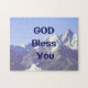 Dieu Béni vous puzzle Bleu avec des montagnes enneigées.