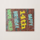 Cette conception amusante de puzzle sur le thème de l'anniversaire comporte un message comme "HAPPY 14th BIRTHDAY, NAME-HERE!", où le nom peut être personnalisé. L'arrière - plan est représenté par un mur en brique composé de briques de couleur rougeâtre. Le texte du message personnalisable comporte des couleurs comme le bleu, le jaune et le vert, et il a un aspect inspiré de celui des graffitis peints. Un puzzle comme celui-ci pourrait être utilisé comme une façon amusante d'envoyer des voeux d'anniversaire à quelqu'un qui célèbre son quatorzième anniversaire, et qui peut-être aime vraiment faire des casse-tête. [~Z0000285]