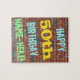 Cette conception amusante de puzzle sur le thème de l'anniversaire comporte un message comme "HAPPY 50th BIRTHDAY, NAME-HERE!", où le nom peut être personnalisé. L'arrière - plan est représenté par un mur en brique composé de briques de couleur rougeâtre. Le texte du message personnalisable comporte des couleurs comme le bleu, le jaune et le vert, et il a un aspect inspiré de celui des graffitis peints. Un puzzle comme celui-ci pourrait être utilisé comme une façon amusante d'envoyer des voeux d'anniversaire à quelqu'un qui célèbre son cinquantième anniversaire, et qui peut-être aime vraiment faire des casse-tête. [~Z0000285]