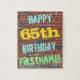 Cette conception amusante de puzzle sur le thème de l'anniversaire comporte un message comme "HAPPY 65th BIRTHDAY, FIRSTNAME!", où le nom peut être personnalisé. L'arrière - plan est représenté par un mur en brique composé de briques de couleur rougeâtre. Le texte du message personnalisable comporte des couleurs comme le bleu, le jaune et le vert, et il a un aspect inspiré de celui des graffitis peints. Un puzzle comme celui-ci pourrait être utilisé comme une façon amusante d'envoyer des voeux d'anniversaire à quelqu'un qui célèbre son soixante-cinquième anniversaire, et qui peut-être aime vraiment faire des casse-tête. [~Z0000285]