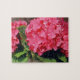 La photographie originale de MaeFlowers sur ce Puzzle de Jigsaw est un closeup d'hydrangées roses et de leurs feuilles verts de printemps déchiquetés. Le pompon central des pétales de fleurs remplit presque la photo, entouré par les feuilles verts et des morceaux d'autres pompons de fleurs de chaque côté.