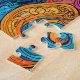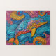 L'image est une illustration colorée d'un dauphin. Le dauphin est au centre de l'image, avec son corps orienté vers le côté droit du cadre. Le corps du dauphin est composé de différentes nuances de bleu, d'orange, de jaune et de rose, autour desquelles tourbillons et motifs. Le style général de l'illustration est abstrait et capricieux, avec un mélange de couleurs vives et de lignes audacieuses.