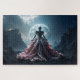 A mysterious figure in an elaborate gown stands before a glowing full moon, set against a dramatic rocky landscape. The scene is enhanced by the contrast between the intricate details of the dress and the rugged terrain.