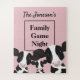 Un puzzle pour la nuit de jeu de famille qui comprend trois vaches, noir et blanc, sur un arrière - plan rose. Le puzzle comprend un nom de famille personnalisable. Ajoutez simplement votre nom de famille, ajoutez ce puzzle à votre panier et laissez les jeux commencer.