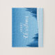Un joli puzzle avec de joyeux voeux de Noël. Paysage hivernal enneigé avec pinède