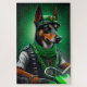 Un ami en fureur derrière les guidons d'une moto verte brillante, portant une tenue verte de la Saint Patrick qui fait tourner la tête. Le chien est habillé d'un ensemble festif, avec une cravate arc-en-ciel verte et un chapeau haut assorti qui se trouve doucement au-dessus de la tête. Le costume présente des motifs complexes de shamrocks et de leprechauns, ce qui indique clairement que ce chien est prêt à célébrer la Saint Patrick avec style.