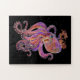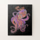 illustration colorée d'un kraken, calmar ou poulpe aux couleurs violettes surréalistes sur un arrière - plan noir en tant que puzzle cool