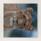 Un gros plan de la tête d'une lionne révèle des yeux bleus fascinants, dressés contre sa fourrure d'or. Capturée en captivité, elle respire la grâce et la force royale.