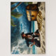 Un pirate s'agenouille au bord d'un torse en bois et de pièces d'or sur une plage tropicale, à l'heure où la tempête se réunit.