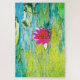 Un nénuphar fuchsia avec feuillage vert citron dans une eau turquoise fait un puzzle d'inspiration Monet.