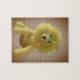 Lion, crocheté en fil jaune de différentes nuances. Yeux verts et nez noir. Belle crinière. Fond en brun texturé.
