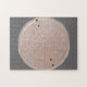 Eisen-Mann-Loch-Abdeckung mit kuchenförmigen Trennflächen. Ein Single in den meisten Segmenten, wobei die Firmeninitialen zwei Leerzeichen nehmen.