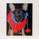 Portrait adorable photo d'un petit chiot portant un pull en laine rouge et bleue doux avec des poms de pom.