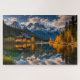 Un lodge rustique au bord d'un lac, avec des montagnes enneigées en arrière - plan, et des trembles en pleine gloire d'automne crée un magnifique puzzle. Parfait pour tous ceux qui aiment la nature et le plein air.