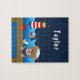 Un adorable marin ours assis sur un pont en bois avec une mouette et un crabe. Dans l'arrière - plan il y a un phare rouge et blanc, un oiseau mignon sur un voilier, des vagues de l'océan et un ciel étoilé bleu marine. Graphiques par PixelPaperPrints et DigitalCurio