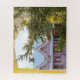 La neige hivernale sur un arbre à feuillage persistant et le porche d'un chalet victorien jaune encadrent le chalet violet dit être le premier construit dans le Camping à Oak Bluffs sur le vignoble de Martha. La Martha's Vineyard Campmeeting Association (MVCMA), une attraction populaire sur l'île, abrite des centaines de cottages en pain d'épices victoriens. Oak Bluffs était autrefois connue sous le nom de Cottage City. Le Martha's Vineyard est situé dans le Massachusetts, juste à côté du cap Cod