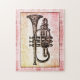 Art vintage avec peinture d'une trompette avec sculpture florale.