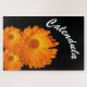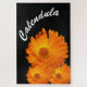 Orangefarbene Calendula-Buds mit Wassertropfen auf Blütenblättern. Drei überlappende Blüten unten rechts. Oben ist gebogener weißer Text (Calendula) mit schwarzem Hintergrund.