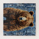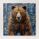 Œuvre d'art vibrante représentant un ours avec une riche fourrure texturée, sur un fond patchwork présentant des tons bleus et gris. L'ours se dresse de manière imposante et réaliste, captivant l'attention avec ses caractéristiques réalistes.