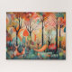 Un tableau coloré d'arbres et de fleurs, dans le style de paysages de villes fantasques, créatures fantastiques et imaginatives, formes distinctes, bois, champs de couleurs musicales, avec un grand format de toile.